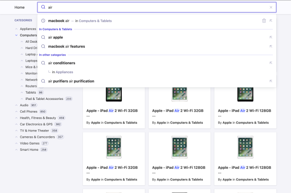 Typeahead dropdown menu with suggested searches built with Algolia Autocomplete and React