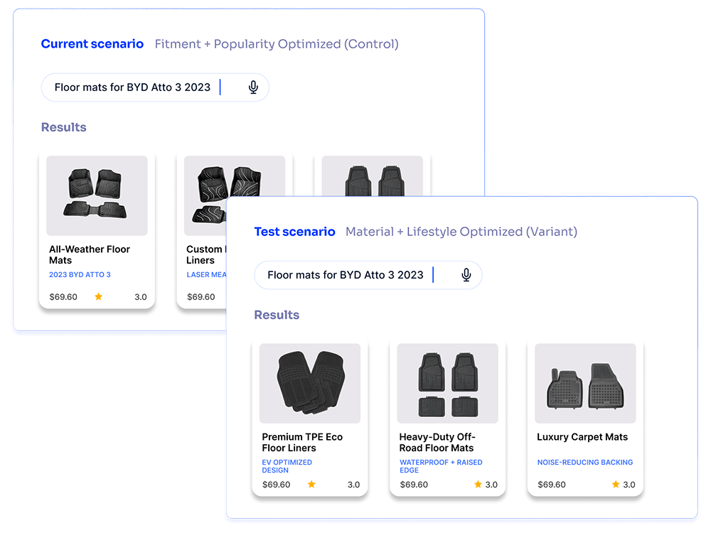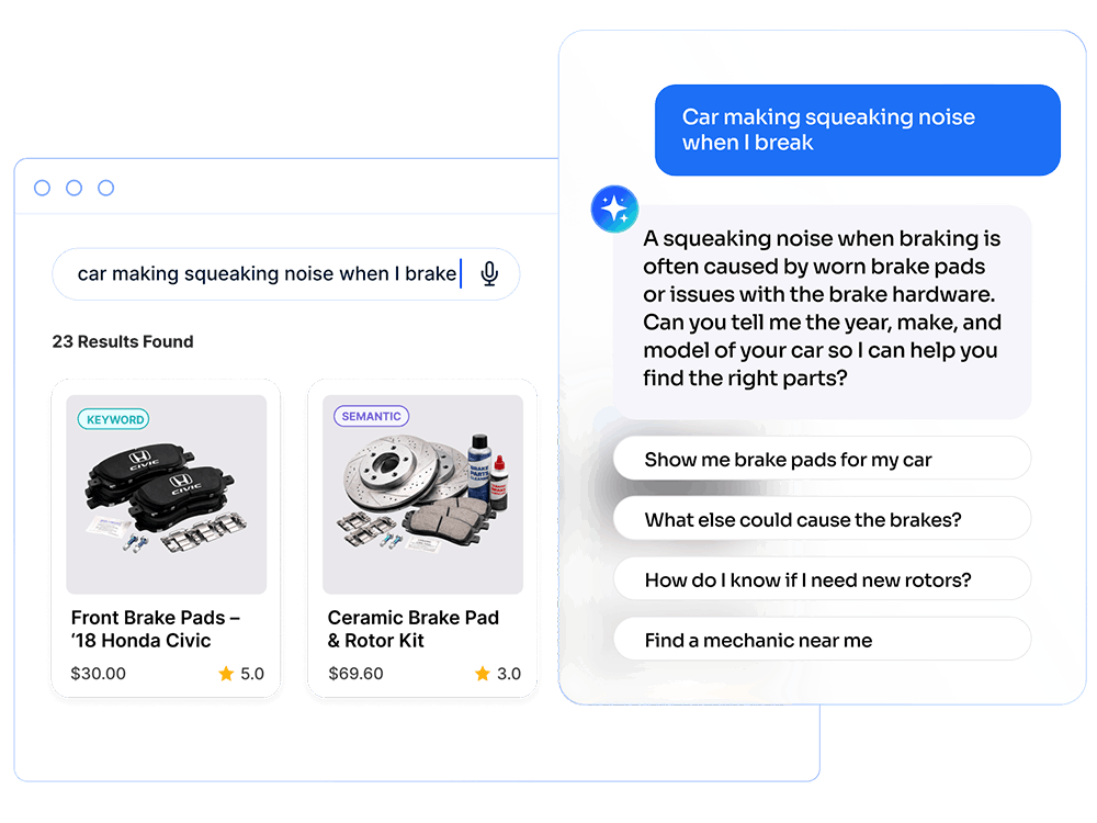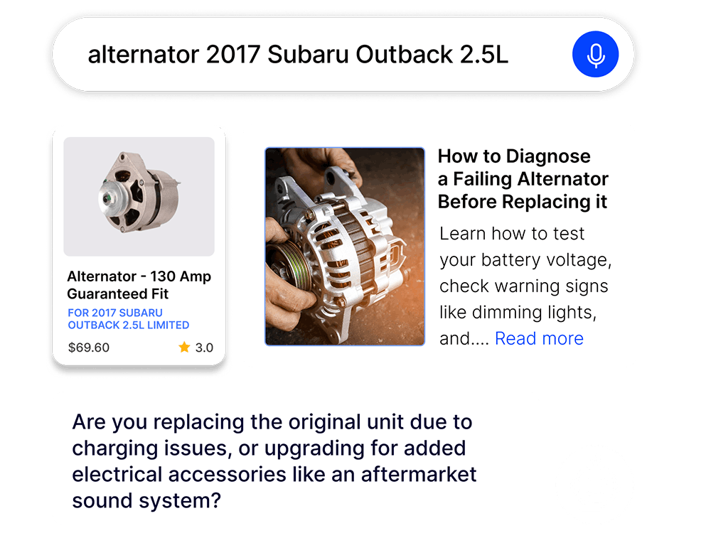 They work best as a connected system. AI Search helps shoppers find the right parts faster by understanding intent (including natural-language queries), matching part numbers and reference formats, and improving relevance. Agent Studio builds on that foundation with conversational, agentic support that can answer fitment and product questions, recommend alternatives, and guide shoppers when they’re uncertain. Generative Experiences add guided discovery—like shopping guides and “choose the right part” flows—that help buyers understand options and compatibility before they commit.